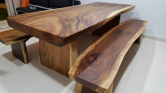 Nos clients peuvent choisir parmi une gamme de finitions pour leur banc en bois de Suar massif, notamment des finitions vernies (mat ou brut), huilées ou brutes pour un aspect plus naturel. De plus, nos piétements en bois de Suar naturel ou métal sont disponibles en forme de U ou X pour s’adapter à différents styles d’intérieur. Nos piètements