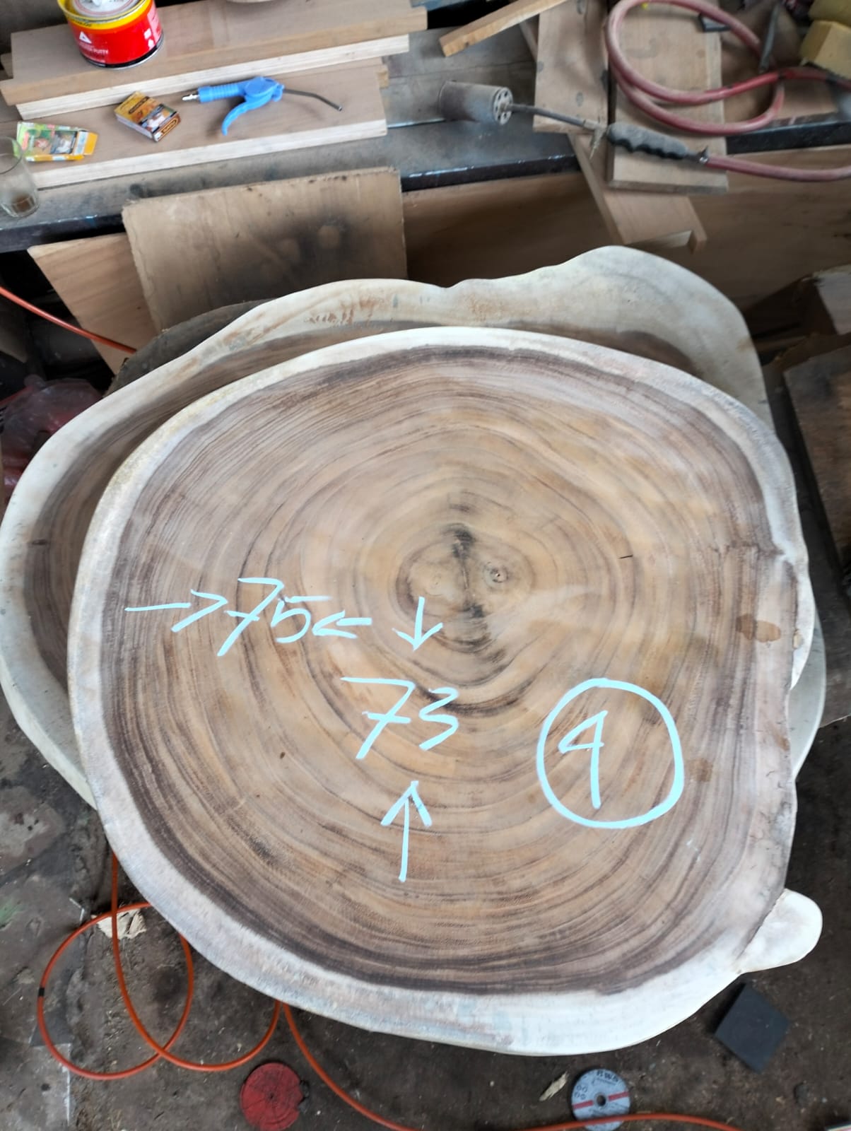 Certaines photos présentent les plateaux dans leur état brut ou patiné pour le transport, conformément aux exigences douanières indonésiennes. Ils seront entièrement retravaillés dans notre atelier en France selon la finition que vous choisirez.