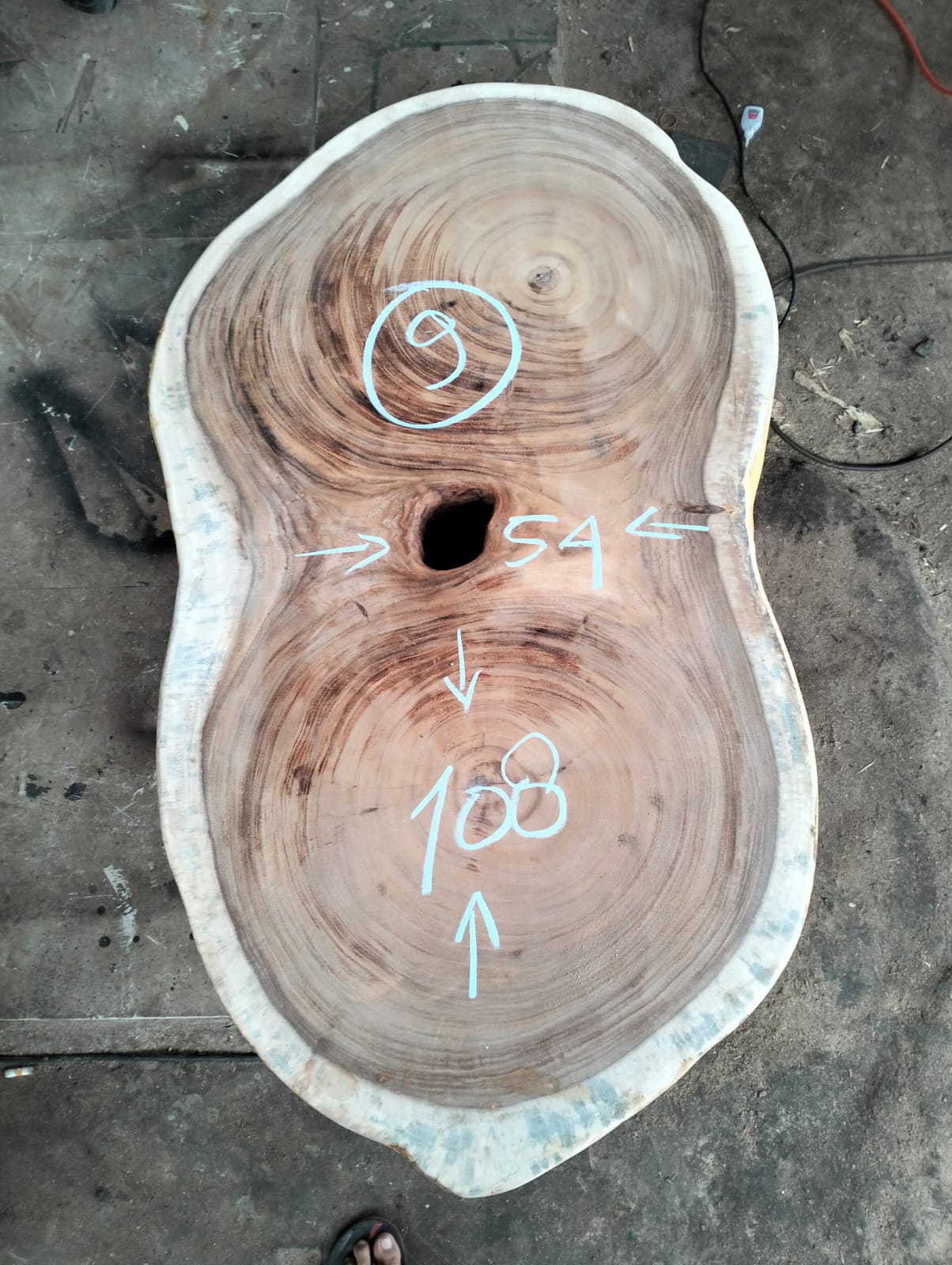 Certaines photos présentent les plateaux dans leur état brut ou patiné pour le transport, conformément aux exigences douanières indonésiennes. Ils seront entièrement retravaillés dans notre atelier en France selon la finition que vous choisirez.