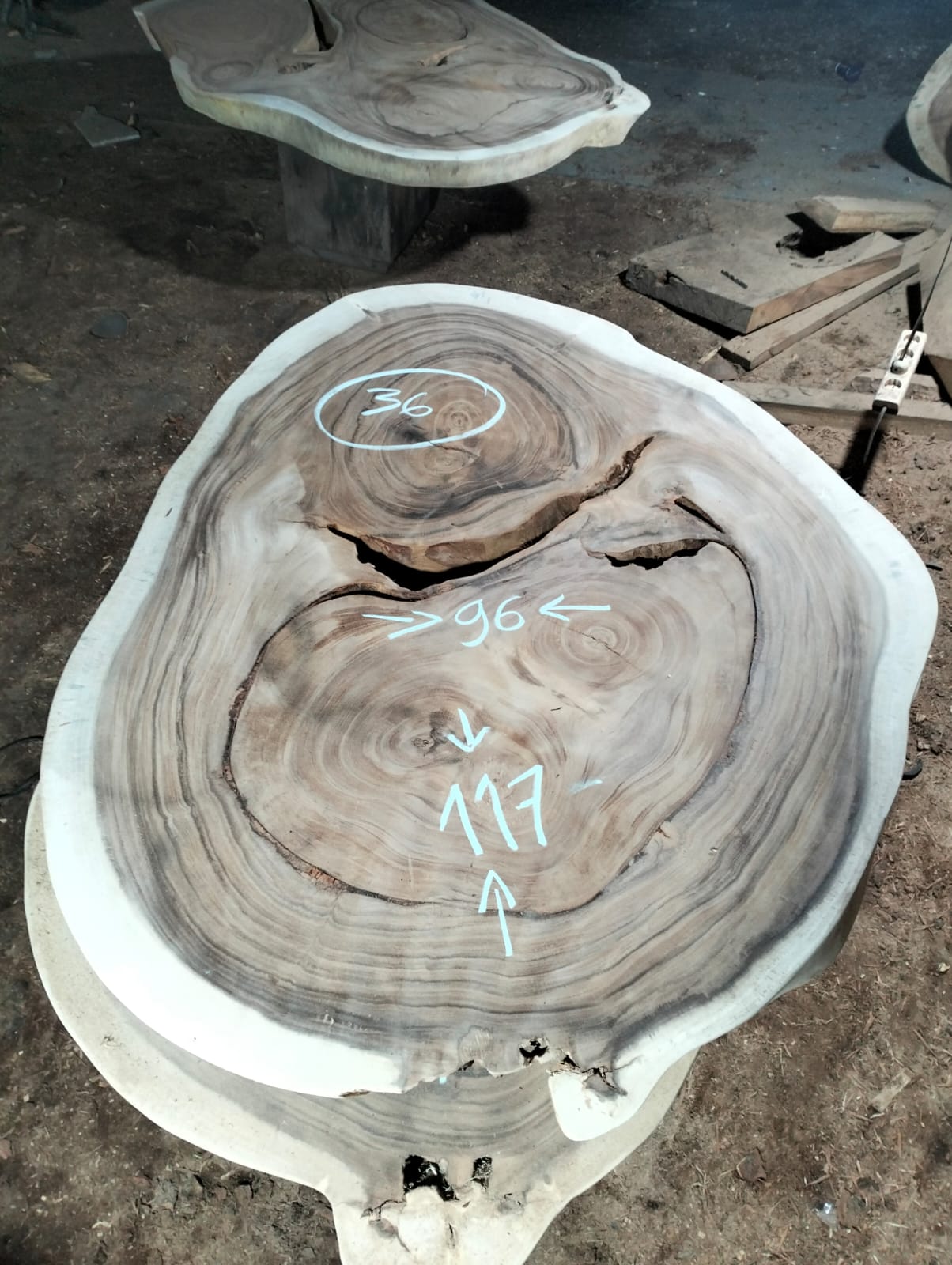 Certaines photos présentent les plateaux dans leur état brut ou patiné pour le transport, conformément aux exigences douanières indonésiennes. Ils seront entièrement retravaillés dans notre atelier en France selon la finition que vous choisirez.