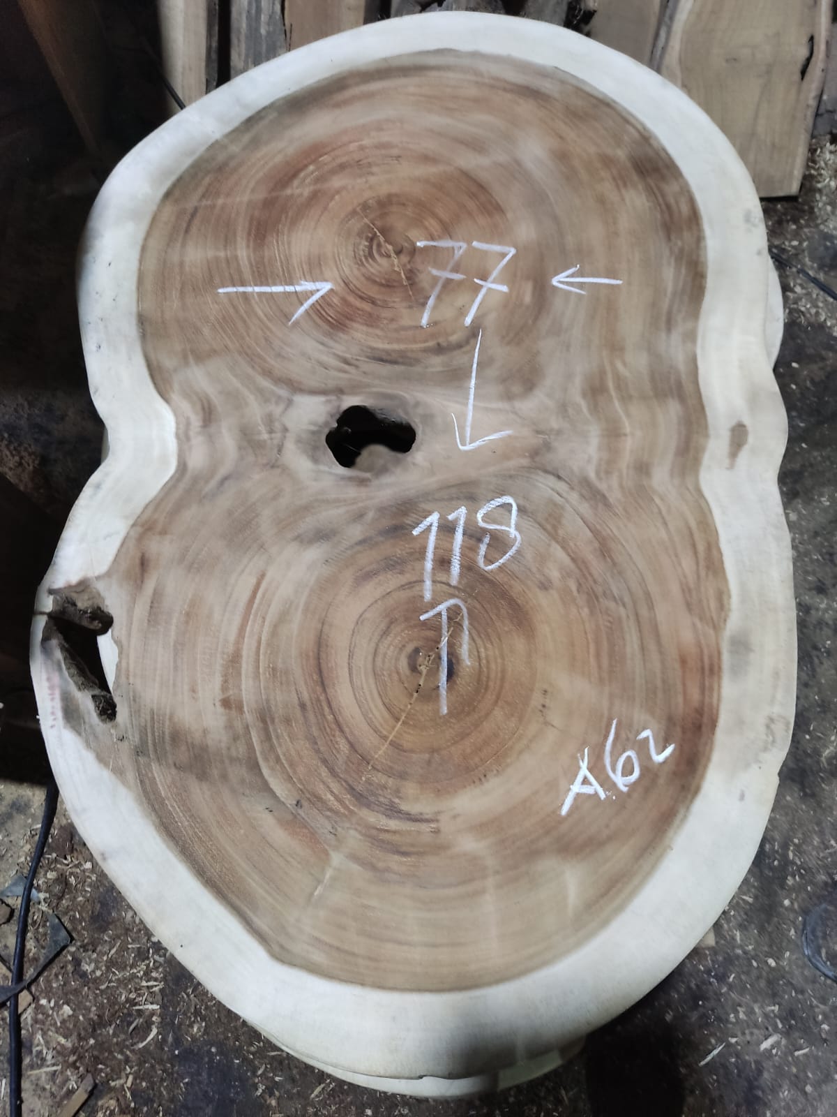 Certaines photos présentent les plateaux dans leur état brut ou patiné pour le transport, conformément aux exigences douanières indonésiennes. Ils seront entièrement retravaillés dans notre atelier en France selon la finition que vous choisirez.